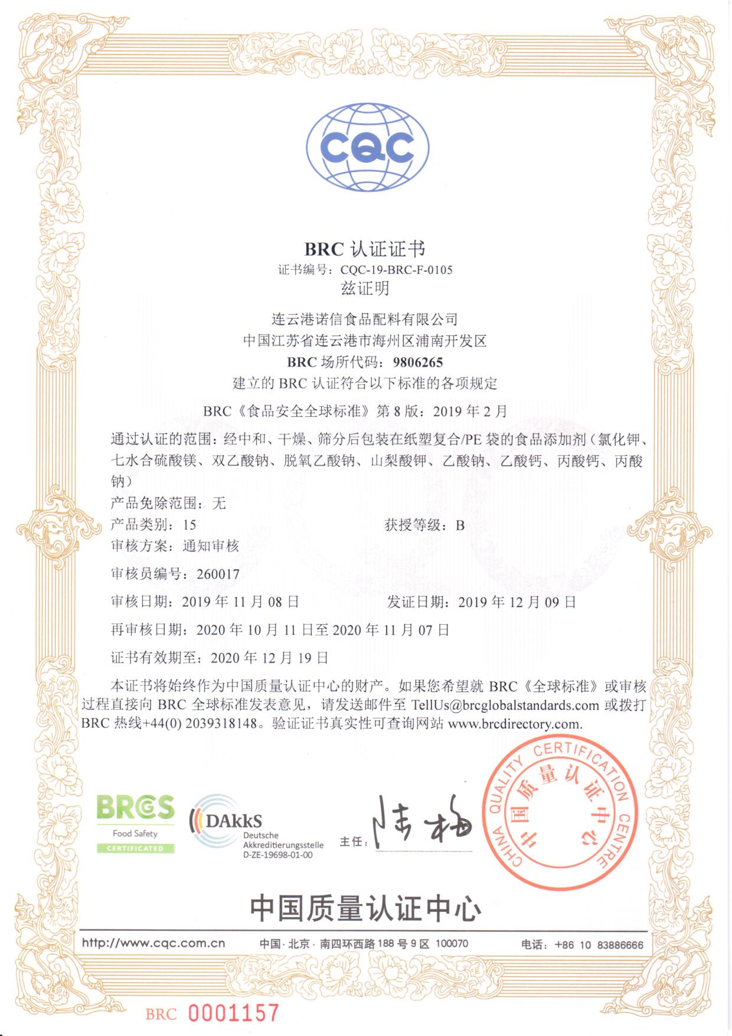 BRC認證證書_雙乙酸鈉,雙乙酸鉀-連云港諾信食品配料有限公司
